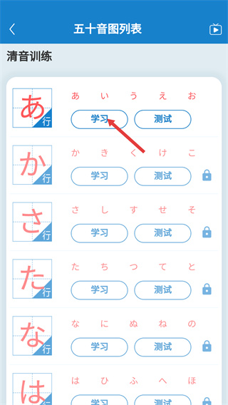 2、進入五十音圖列表后,在清音訓練模塊找到あ行,點擊其對應的“學習”按鈕,即可進入あ行的專屬學習界面。