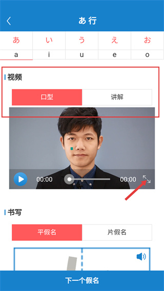 3、在あ行學習界面中,可通過“口型”視頻觀察發(fā)音口型,也能切換“講解”選項,了解該假名的相關(guān)知識內(nèi)容。