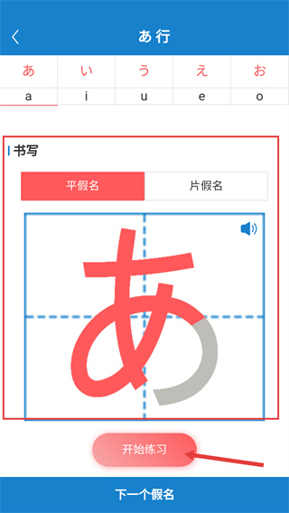 4、切換至あ行的書寫模塊,選定平假名類型后,點擊“開始練習”按鈕,就能進行あ的平假名書寫練習。