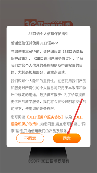 1、使用【3E口語APP】前,需閱讀【3E口語隱私保護政策】-【3E口語用戶服務協(xié)議】,點擊【同意】按鈕進入應用。