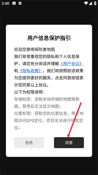 1、在【用戶信息保護(hù)指引】頁面,點擊【同意】按鈕,確認(rèn)《用戶協(xié)議》和《隱私政策》,進(jìn)入探險者地圖主功能界面。