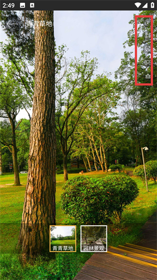 4、進(jìn)入【青青草地】VR頁面后,可使用右側(cè)功能按鈕,操作VR實景的瀏覽模式,查看該景點的不同視角內(nèi)容。