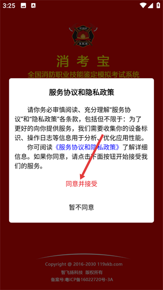 1、打開(kāi)消考寶后,在【服務(wù)協(xié)議和隱私政策】彈窗中點(diǎn)擊【同意并接受】按鈕,即可進(jìn)入應(yīng)用的課程中心頁(yè)面。
