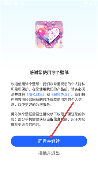 1、在“個(gè)涂壁紙”的隱私保護(hù)指引頁(yè)面,點(diǎn)擊【同意并繼續(xù)】按鈕,確認(rèn)《隱私政策》與《服務(wù)協(xié)議》,進(jìn)入應(yīng)用首頁(yè)。