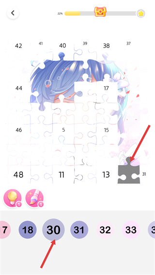 3、在拼圖界面中,選擇對(duì)應(yīng)編號(hào)的拼圖塊(如“30”號(hào)塊),完成拼圖的拼接操作。