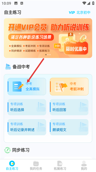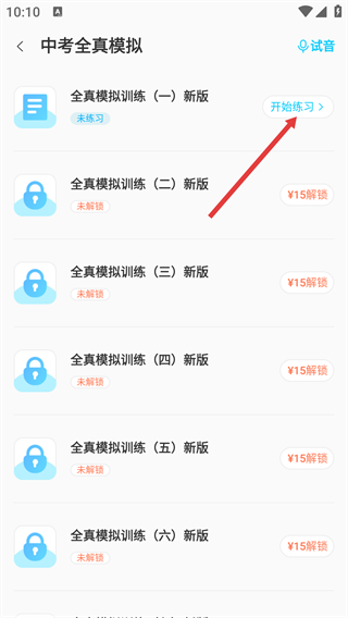 1、在自主練習界面,找到【中考全真模擬】選項并點擊,進入中考全真模擬的訓練列表頁面。