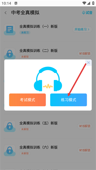 3、在模式選擇彈窗中,點擊【練習模式】選項,進入該訓練對應的具體練習頁面。