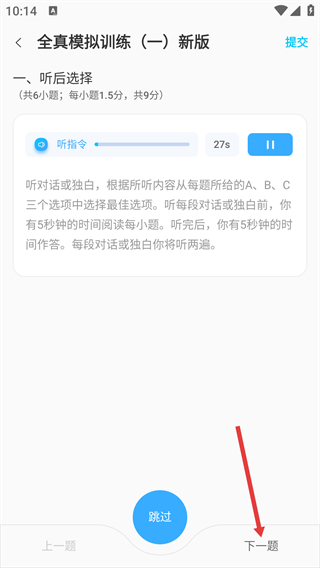 4、進入練習頁面后,完成當前題目的操作,點擊頁面底部的【下一題】按鈕,繼續(xù)進行后續(xù)的練習內(nèi)容。