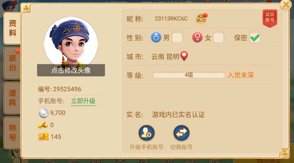 1、打開進入博雅棋牌游戲大廳,首次登錄會可以選擇使用試玩賬號,然后點擊左上角的個人頭像,進入個人主頁。