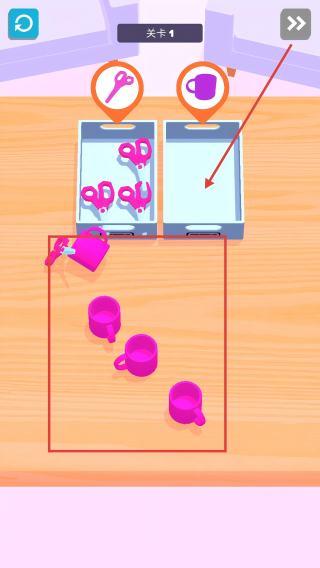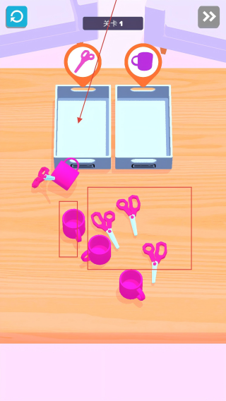 1、關(guān)卡1中,根據(jù)上方【剪刀】【杯子】標(biāo)識(shí),分揀對(duì)應(yīng)物品到手機(jī)框。