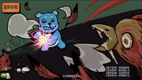 1、點(diǎn)擊【點(diǎn)擊屏幕繼續(xù)游戲】,進(jìn)入冒險(xiǎn),操控藍(lán)色小熊戰(zhàn)斗闖關(guān)。