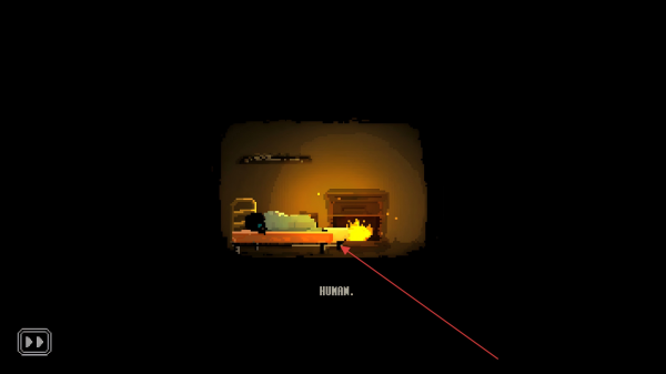 1、看到畫面中躺著的角色,留意下方【HUMAN.】提示,觀察周圍環(huán)境,準(zhǔn)備開啟后續(xù)劇情。