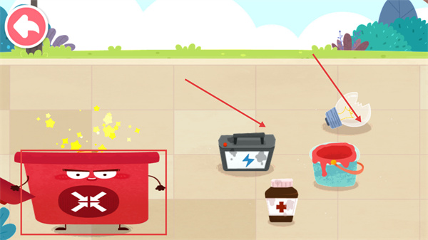 4、把【廢燈泡】【電池】等有害垃圾,投放至紅色有害垃圾桶,完成有害類垃圾的規(guī)范分類。