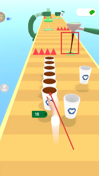 2、持續(xù)操作杯子,盡可能多地接住液體,同時(shí)躲避紅色三角等障礙,提升液體收集效率。