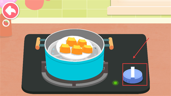 4、調(diào)整【爐灶旋鈕】開啟加熱功能,對鍋中的糕點塊進行烹飪,完成該關(guān)卡的食物制作任務(wù)。