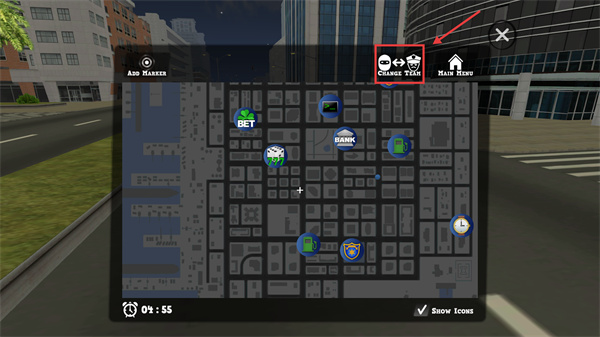 2、打開地圖界面點擊【CHANGE-TEAM】,可切換陣營(如罪犯/警察),體驗不同陣營的任務(wù)與玩法機(jī)制。