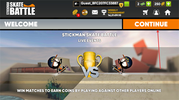 2、在界面點(diǎn)擊【CONTINUE】按鈕,進(jìn)入線上匹配玩法,可與其他玩家對(duì)戰(zhàn)贏取金幣。