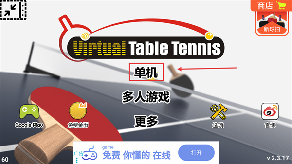 1、選擇【單機】模式進入游戲,這是體驗【Virtual-Table-Tennis】的基礎入口,適合單人練習。