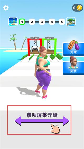 1、在關(guān)卡界面,點(diǎn)擊【滑動(dòng)屏幕開始】按鈕,操控角色在【Play】與【Yoga】路線間選擇,開啟瘦身挑戰(zhàn)。