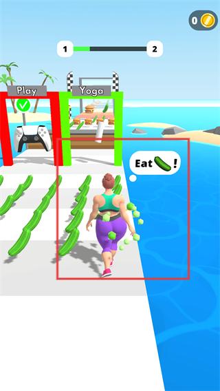 2、沿路線移動(dòng)角色,跟隨【Eat!】提示拾取黃瓜,同時(shí)避開高熱量食物,推進(jìn)瘦身進(jìn)度條。