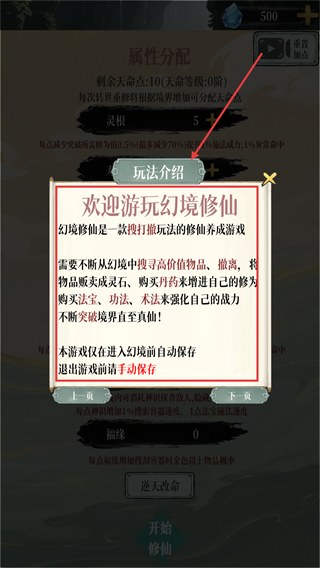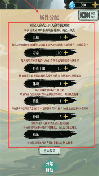 2、屬性分配優(yōu)先加靈根減突破修為消耗,壽命留足進(jìn)幻境的量,丹毒上限與體魄也可適當(dāng)加。