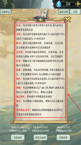 3、查看屬性說(shuō)明了解壽命影響幻境次數(shù),靈根減突破需求,神識(shí)提升搜索和施法速度。