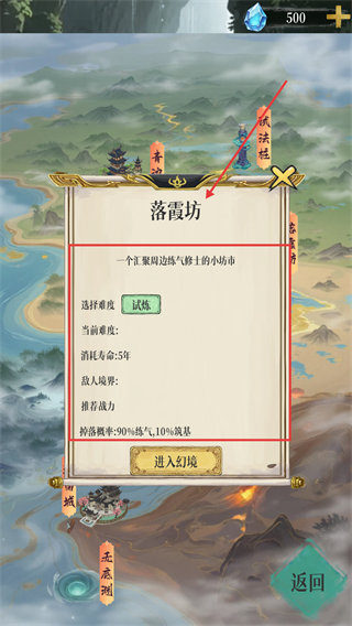 4、選擇落霞坊試煉難度幻境,確認(rèn)消耗5年壽命合理,滿足推薦戰(zhàn)力后點(diǎn)擊進(jìn)入探索。