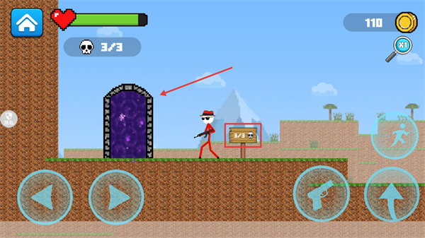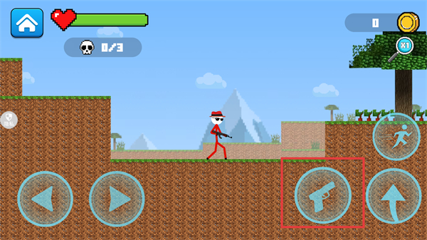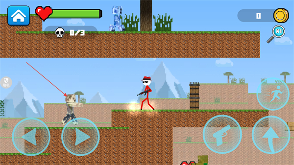 1、進(jìn)入關(guān)卡后,點(diǎn)擊右側(cè)的武器按鈕,控制火柴人移動(dòng),準(zhǔn)備迎戰(zhàn)敵人。