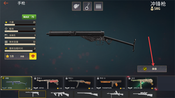 1、在武器界面選擇【沖鋒槍】類的武器,查看其屬性后,點(diǎn)擊【裝備】按鈕使用。