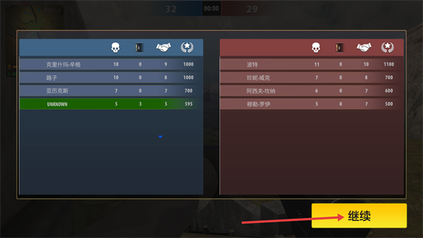 4、對(duì)戰(zhàn)結(jié)束后查看戰(zhàn)績(jī)面板,了解本局的數(shù)據(jù),點(diǎn)擊【繼續(xù)】按鈕可開啟下一場(chǎng)對(duì)戰(zhàn)。