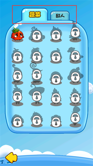 1、在【蔬菜】-【敵人】切換界面中,初始解鎖【小番番】角色,其余角色需完成對應條件解鎖,按箭頭指引推進。
