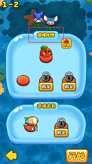 2、進入關卡前,在【選擇伙伴】界面選初始【小番番】,搭配道具,點擊【開始】進入關卡。