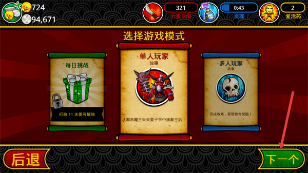 1、在游戲模式選擇界面選【單人玩家-故事】,點(diǎn)擊【下一個】進(jìn)入關(guān)卡,開啟主線劇情戰(zhàn)斗。