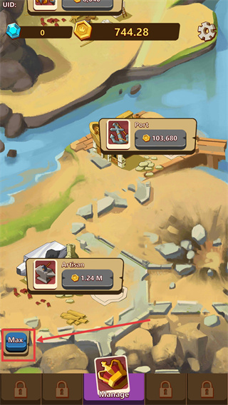 4、點(diǎn)擊【Max】按鈕可快速完成資源收取,同時(shí)解鎖【Port】【Artisan】等高階模塊拓展經(jīng)營(yíng)維度。
