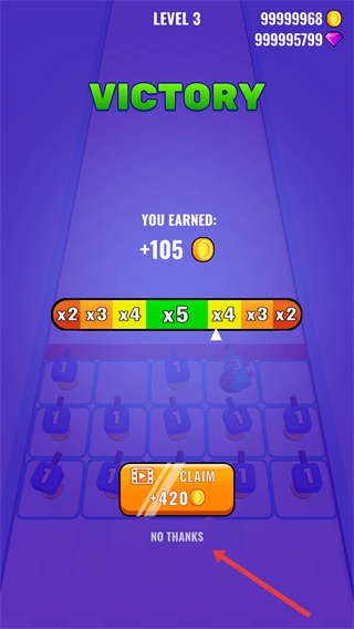 4、通關(guān)后獲得【+105金幣】等獎(jiǎng)勵(lì),點(diǎn)擊【NOTHANKS】跳過額外獎(jiǎng)勵(lì),推進(jìn)流程。