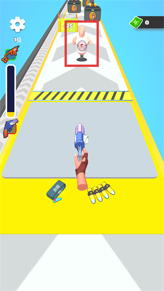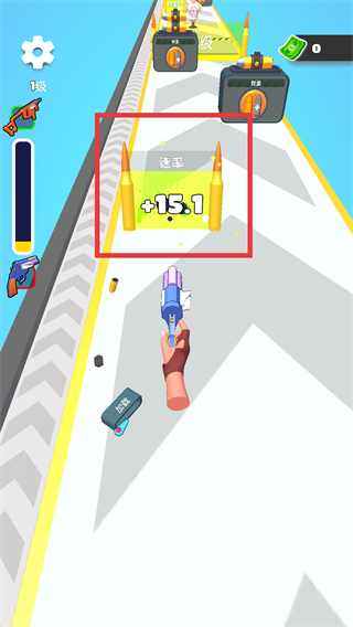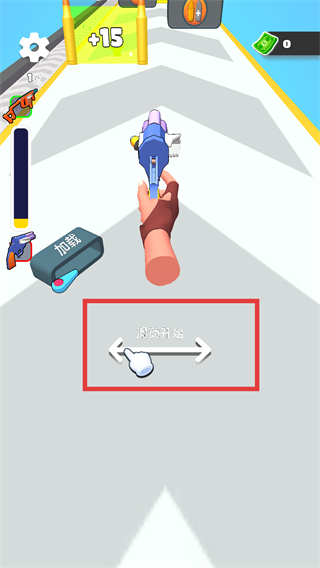 1、在賽道中左右滑動(dòng)控制角色移動(dòng),收集路徑上的【加載】道具,為槍支補(bǔ)充子彈。