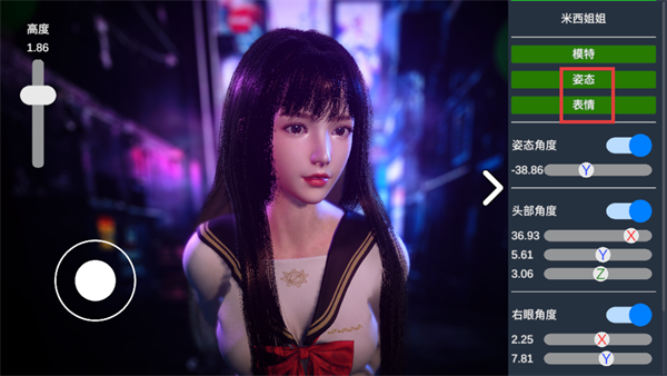 2、選擇【姿態(tài)】與【表情】選項(xiàng),調(diào)整其相關(guān)參數(shù),定制模特的呈現(xiàn)效果。