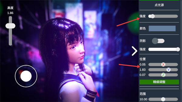 3、在【點(diǎn)光源】界面調(diào)節(jié)【強(qiáng)度】滑塊,同時(shí)配合【陰影】的參數(shù)來優(yōu)化光線效果。