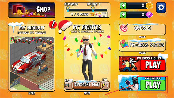 1、在主界面點(diǎn)擊【PROGRESS-PLAY】進(jìn)入關(guān)卡,可先通過(guò)【MY-FIGHTER】升級(jí)角色屬性提升戰(zhàn)斗能力。