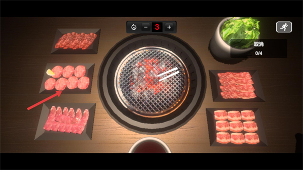 3、對(duì)戰(zhàn)界面中,烤架周圍有不同品類的生肉餐盤,需選擇餐盤里的生肉移動(dòng)到烤架上烤制。