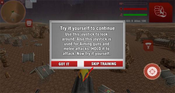 1、進(jìn)入游戲后,界面彈出操作提示,說明搖桿能控制視角、瞄準(zhǔn)槍械及近戰(zhàn)攻擊,需長按搖桿發(fā)起攻擊,點擊跳過訓(xùn)練即可略過引導(dǎo)。